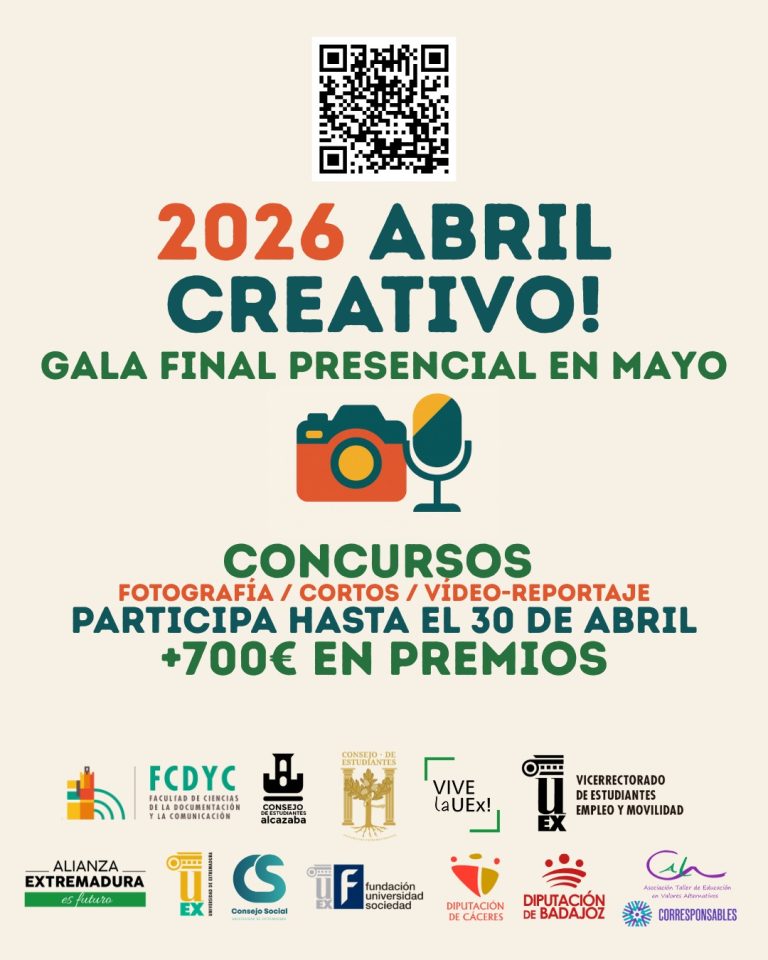 Desde la Universidad de Extremadura, con la participación del Consejo de Estudiantes, Consejo Alcazaba, Facultad de Ciencias de la Documentación y la Comunicación, Vicerrectorado de Estudiantes con coordinación de Vive la UEx! y colaboración de la Diputación de Badajoz, la Diputación de Cáceres y el programa de la Alianza Extremadura es futuro, se lanza la segunda edición de Abril Creativo!
